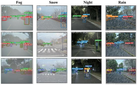 Figure 12, it can be observed that although the images processed by Domain Translation significantly mitigated the impact of adverse weather conditions (such as rain, snow, and fog) on image quality, some residual noise, like “rain streaks” and “snow streaks”, still persisted. These residual noises indicated that the negative effects of adverse weather on RGB images were not entirely eliminated, which, to some extent, continued to pose challenges for object detection tasks.