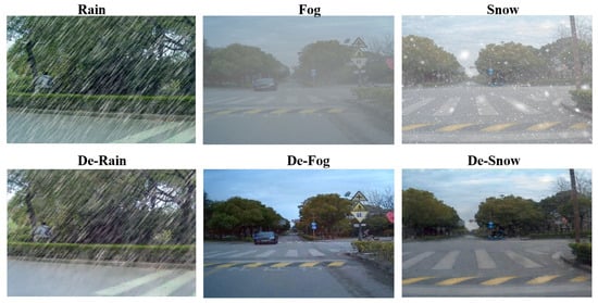 1] to eliminate the detrimental effects caused by weather, thereby enhancing the quality of captured information. However, image restoration algorithms may introduce issues such as pixel shifts or residual “weather traces” during image processing, failing to effectively address the information loss challenges posed by adverse weather conditions. Therefore, there is a need to explore more comprehensive and effective approaches to counteract the negative influence of adverse weather on the visual perception of autonomous driving systems.