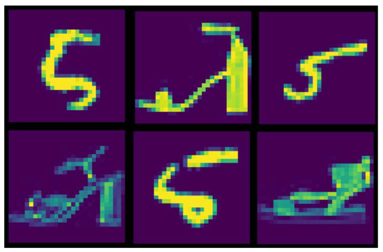 The model struggles to differentiate between the figure “5” from the MNIST set and the sandal images from the FMIST set. A classic CNN could be trained to separate these fairly easily, but, when one is a complete unknown and the probability level is an essential metric, the task is more complex. When checked visually, both have similar line shapes and a large amount of negative space, both surrounding the shape and encircled within the lines as can be observed in Figure 2. This set of images was taken from the samples that the network was attempting to identify, i.e., the source of image confusion.
