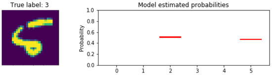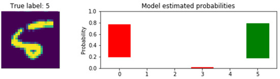 Looking into the specifics, this way allows for closer investigation of not only particular images, often showing that there would be a mix of confidence levels, but also the effects of wider network alterations on predictions. For the distribution visuals, plotting code was adapted from a previous demonstration [17]. Figure 4 shows what the model estimated the labels to be for a “5” image where the sandal image had been assigned the label of 0.
