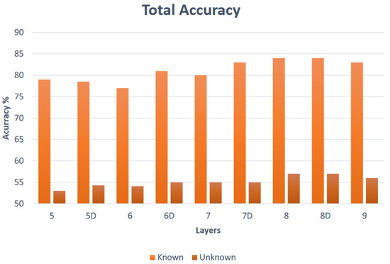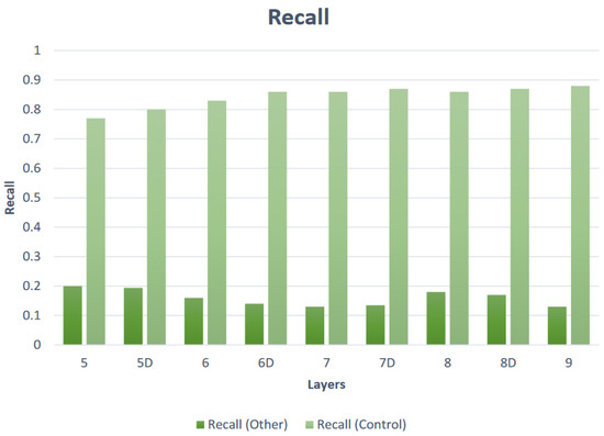 Figure 7 and Figure 8 show the developing accuracy and recall for different layer configurations for control and unknown classes; while there are setups that have higher scores than 7D, the key metric remained the confidence delta, which was at its highest with this structure, and the levels are still strong for these secondary metrics. It can be seen that the addition of dropout layers had a noticeable effect on the total accuracies up to a point yet a less significant effect on the recall. For known data, the accuracy levels from six layers onwards are reasonable, approaching 85%+ after seven layers. For unknown data, it is desirable in this study that the accuracy is low as this does not pertain to the unknown datasets. Any “accurate” predictions would in reality be incorrect as they would reflect wrong or coincidental predictions or the reassigned label, and a high pattern of these would indicate a problem within the model. High accuracy levels returned here would therefore indicate low model performance overall. The same is true of the recall results. Again, all are promising, with the majority over 0.8 and approaching 0.9. As with the accuracy statistics, it is desirable that the unknown plots remain low in terms of recall for the same reasons. By continuing to return to the individual epistemic distributions as well as the overall probability and recall metrics, the BNN approach again delivers unique and effective methods of appraising and restructuring the network configuration.