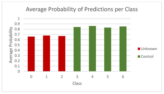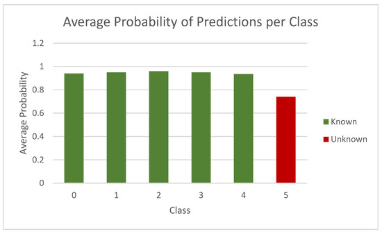 Once trained with the training sets, the model was given a test set consisting of both known unknowns and unknown unknowns and the results analyzed. While key metrics were strong accuracy for the control classes, high recall, and F1 scores, the main goal was a significant difference in probability levels between the control and unknown classes to determine a proper threshold for rejecting a datapoint. After tests were run, the average probability of predictions per class was collected and visualized in order to review this, with insignificant deltas indicating that the model was not yet performing successfully. Where this was the case, the results were investigated further in terms of probability distribution and epistemic uncertainties for specific datapoints, system entropy, and image confusion.