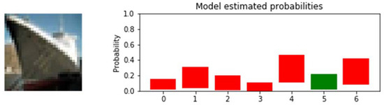 Distributed label probabilities for unknown image (ship). Here, the green bar represents a false positive from relabelling, with the red bars indicating incorrect classification.