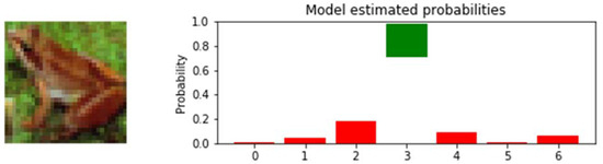 This is further seen in Figure 12, in which the model does not require much consideration to assign the correct label to a control test image of a frog. While other options are deliberated, this is brief, and the confidence in them is very low. The model selects the correct label (3) with high confidence, with the plot providing an insight into the inner workings of the classification process, i.e., contemplation against known possibilities.