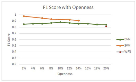 Another goal of this study was to maintain strong metrics across a variety of mixed sets and levels of openness. A range of levels was tested in experiments, and the results are presented in Figure 13 along with those from a study using Support Vector Machines in a probabilistic approach to OSR [23].