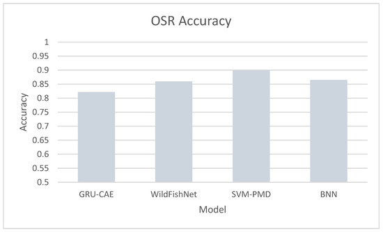 The ODR accuracy of the BNN method is shown alongside recent novel approaches in Figure 14. There is a mix of data types: sound waves for GRU-CAE [25], colour images for WildFishNet [27], and generated nuclear industrial data for SVM-PMD [26]. All reach promising levels of accuracy, and the BNN results demonstrate that the methods proposed here can compete with other emerging ideas and experiments.