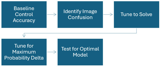 This was then used as feedback to tune the model further, reconfiguring its architecture and operations to progress towards the best working network. As the main metric of the confidence delta was custom, automated tuning was not useful in this research work, and the majority of the network architecture was constructed through bespoke layering as opposed to solely off the shelf functions. Different layer types and orders were experimented with, as well as optimizers, activation functions, training epochs, and normalization methods such as batch normalization and the inclusion of dropout layers in order to arrive at the optimal design for the metrics described through minimizing overfitting and controlling loss and validation accuracies. To appraise the network configurations, the total accuracy and the recall values for both control and unknown test data were collected; it was desirable that they were consistently high for the former and low for the latter, as there would be no correct predicted value for the unknowns. Ultimately, there were two significant tuning goals involved in this method once an initial baseline model focusing simply on recall for the control data: image confusion tests and maximizing the probability delta. To achieve these, experiments were run covering various selections of