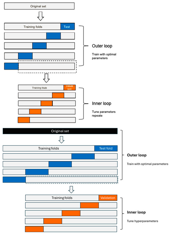 Model evaluation was conducted using nested cross-validation, an advanced generalization of the traditional train–validation–test split, designed to mitigate overfitting and reduce bias [48,49]. As illustrated in Figure 2, the inner loop employed repeated stratified 5-fold cross-validation (5 folds repeated 5 times) to tune the hyperparameters for each algorithm. Specifically, LR was implemented within a pipeline that first standardized the data and then applied multinomial logistic regression with an L2 penalty; its regularization parameter (C) was tuned over an exponential range from 10−4 to 103. The KNN classifier, also preceded by standard scaling, was optimized by varying the number of neighbors from 1 to 9 and testing the distance metric parameter (p) for both the Manhattan (p = 1) and Euclidean (p = 2) distances. The DT classifier was configured to explore different tree complexities by tuning the maximum depth with values from 1 to 9, as well as allowing for an unlimited depth (none) and comparing the splitting criteria of ‘gini’ versus ‘entropy’. For the SVM, a pipeline with standard scaling was used with the classifier set to provide probability estimates. Hyperparameter tuning was carried out for two kernel scenarios: for the RBF kernel, both the regularization parameter C (ranging from 10−4 to 103) and the kernel coefficient gamma (ranging from 10−5 to 10−1) were evaluated, whereas for the linear kernel, only the C parameter was tuned over the same range. The RF classifier was tuned by varying the number of trees (n_estimators) with candidate values of 10, 100, 500, 1000, and 10,000. For each classifier, a grid search was performed using the inner cross-validation to exhaustively explore the hyperparameter grid, and the optimal hyperparameters were selected based on the average performance metrics.