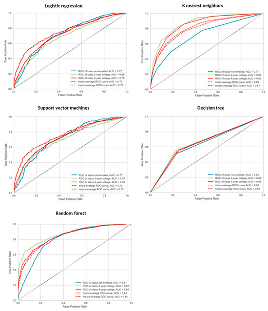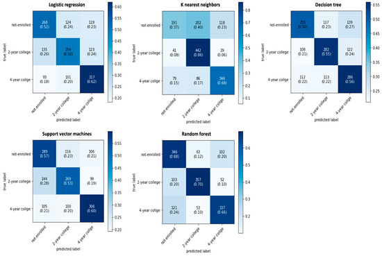 This study applied five widely used machine learning classifiers, including logistic regression (LR), k-nearest neighbors (KNN), support vector machines (SVMs), decision trees (DTs), and random forests (RFs), to identify the optimal predictive model. These algorithms were selected because they represent distinct statistical approaches to classification. Specifically, LR is a linear classifier that models the probability of class membership using a logistic function. KNN is an instance-based learning method that classifies samples based on the majority vote of their k-nearest neighbors. An SVM is a margin-based classifier that identifies the optimal hyperplane to maximize the separation between classes. A DT is a non-linear, rule-based model that recursively splits data into branches to form a decision tree. RF is an ensemble method that improves the prediction accuracy by aggregating multiple decision trees. These models are well established in social science research due to their interpretability and robust performance, making them particularly suitable for analyzing enrollment decisions. Unlike more complex models (e.g., deep learning or transformer-based architectures), these classifiers offer a balance between predictive power and the ease of interpretation. Among them, LR served as the baseline model due to its simplicity, low variance, and widespread use in educational research. Its transparency and stable performance make it a reliable benchmark for evaluating the effectiveness of more sophisticated classifiers.