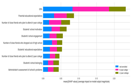 As shown in Figure 5, the top 10 important features for predicting college enrollment status were the high school GPA, parental educational expectations, the number of close friends who plan to attend a 4-year college, the students’ school motivation, the students’ school engagement, the number of close friends who dropped out of high school, the students’ educational expectations, the number of close friends who plan to attend a 2-year college, the students’ sense of school belonging, and the administrators’ assessment of school problems. Moreover, this plot displays the relative importance of the ten variables for predicting each college enrollment status (i.e., not enrolled, enrolled in a 2-year or less college, and enrolled in a 4-year college). The three most important factors for predicting student enrollment in 2-year and 4-year colleges were the high school GPA, parental educational expectations, and the number of close friends who plan to attend a 4-year college. In addition, the high school GPA, parental educational expectations, and the number of close friends who dropped out of high school were the top three predictors of students not enrolling in college.