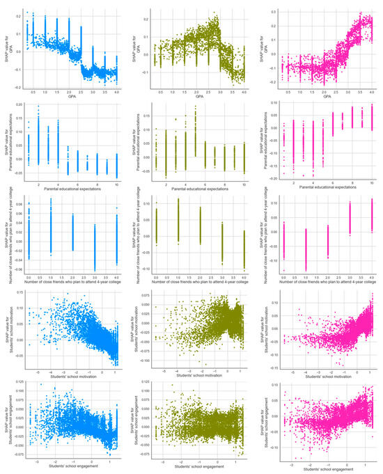 The SHAP-dependent plot shows the relationship between each variable and its SHAP value for each enrollment status (see Figure 6). There was a negative, quadratic, and positive correlation between the high school GPA and the SHAP values for each enrollment status, with the highest SHAP values occurring for a GPA = 0.5 for those who were not enrolled in any institutions, GPA = 2.8 for those who were enrolled at a 2-year institution, and GPA = 3.5 for those who were enrolled at a 4-year institution. Similarly, there was still a negative, quadratic, and positive correlation between parental educational expectations and the SHAP values for each enrollment status. The highest SHAP values corresponded with expectations = 2 (i.e., expectation of obtaining a high school diploma or GED) for those who were not enrolled in any institutions, with expectations = 5 (i.e., expectation of starting a bachelor’s degree) for those who were enrolled in a 2-year institution, and with expectations = 10 (i.e., expectation of earning a Ph.D./M.D./law degree/other professional degree) for those who were enrolled in a 4-year institution. The number of close friends who plan to attend a 4-year college (0 = none of them, 1 = less than half, 2 = about half, 3 = more than half, 4 = all of them) had a negative relationship with the SHAP value for not enrolling in college and enrollment in a 2-year college, but a positive relationship with enrollment in a 4-year college. Finally, the relationship between student school motivation, school engagement, and their SHAP values were similar, with a negative association for those not enrolled in college, positive association values for those enrolled in a 4-year college, and an unclear pattern for those enrolled in a 2-year college. These findings indicate that enhanced school motivation and engagement are associated with both a reduced likelihood of college non-enrollment and an increased probability of enrollment in a 4-year college.