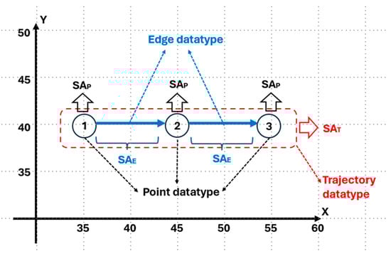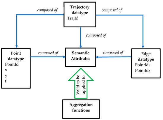 So far, datatypes for points, edges, and trajectories have been defined. Note that structurally, these three datatypes have one element in common: their respective semantic attributes and aggregate functions that can be applied to each one. This allows the analyst to place a given semantic attribute on the appropriate datatype, whether on a point, on an edge, or on a trajectory. In Figure 2, the composition of the defined datatypes is outlined.