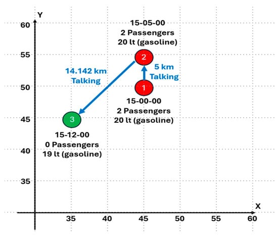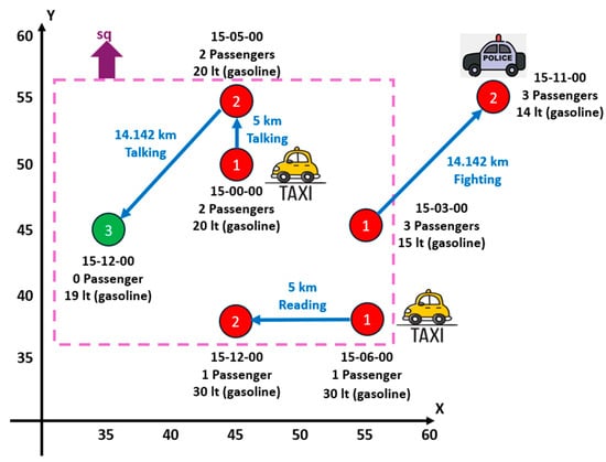 Consider the point value Pv = (1, 40, 50, 25-Apr-2024:15-00-00, {true, 100, 2}). Here, the semantic attributes are SAP = {busy, gasolineLevel, numberofPassengers}; thus, in this point value, the point is busy (true), the gasoline level is 100, and there are two passengers. We note that the semantic attribute busy is a derived attribute: if numberofPassengers > 0, then busy is true; else, it is false.
