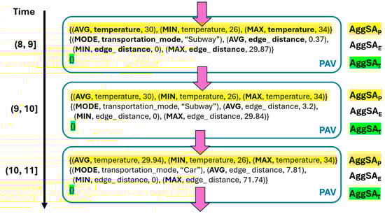 Therefore, PAV = (AggSAP, AggSAE, AggSAT) = ({(AVG, gasolineLevel, 22.333), (AVG, numberofPassengers, 1.5), (SUM, numberofPassengers, 9)}, {(SUM, distance, 24.142), (MODE, passengersActivity, “Talking”)}, {(MODE, vehicleType, “Taxi”)}).