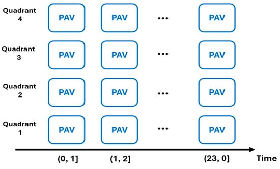 The proposed algorithms are applied to each quadrant, considering again the date, 11 September 2011, and dividing it into the same 24 time intervals that were used when the entire region was considered. The results are shown in Table 4,Table 5 and Table 6. Note that for the first quadrant, there were only values (in the dataset) for the interval (7–8] and for the fourth quadrant in the interval (3, 4]. There were no results for the third quadrant (this means that on 11 September 2011, there were no trajectories that visited this quadrant).