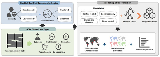 Figure 1 illustrates the conceptual definitions and analytical framework of the study. First, we defined the SCDi and its transformation types. Second, we modeled the SCDi transformation types by integrating various factors using the random forest algorithm. Finally, the study results encompassed the spatiotemporal characteristics of the SCDi and its transformations, the globally simulated transformation probabilities, and the importance of different features. By integrating multisource data and applying machine learning methods, this research aimed to provide a comprehensive and dynamic perspective for understanding and predicting conflict transformations worldwide, thereby supporting the development of more effective intervention and mitigation strategies.