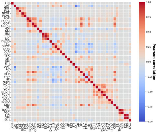 In total, we compiled a dataset of 47 variables covering four key dimensions: conflict-related, socioeconomic, climate and disasters, and geographic, as presented in Table 1. To mitigate potential issues arising from highly collinear features and to ensure robust variable importance assessments during modeling, we computed the Pearson correlation coefficient matrix for all variables. As shown in Figure 2, the vast majority of variable pairs (93.80%) exhibited correlation coefficients below 0.3, with only a small proportion (0.83%) exceeding 0.7. Based on this analysis, we excluded six variables—elevation standard deviation, urban proportion, total number of conflicts in the vicinity last year, critical infrastructure index, total number of global conflicts last year, and oil price index—due to high collinearity. The remaining 41 variables were retained for the modeling process.