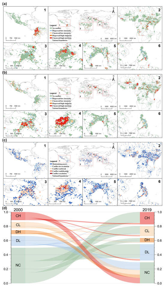 The spatiotemporal characteristics of armed conflict risk transformation. (a) SCDi types in 2000; (b) SCDi types in 2019; (c) compared with 2000, the types of armed conflict transformation based on the SCDi in 2019; and (d) SCDi type changes in grid cells that experienced conflict in either 2000 or 2019. (Note: Figure 3 only displays results for grid cells that experienced at least one conflict between 2000 and 2019. Grid cells where SCDi remained as maintaining peace throughout this period are shown in the background color).