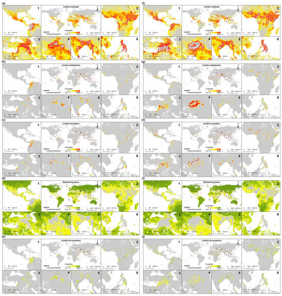 The spatial probability distributions of different armed conflict transformation types in 2001 and 2019. Panels (a,f) represent the probability distributions of armed conflict outbreaks in 2001 and 2019, respectively; panels (b,g) represent the probability distributions of the stabilization of armed conflicts in 2001 and 2019, respectively; panels (c,h) represent the probability distributions of escalating armed conflicts in 2001 and 2019, respectively; panels (d,i) represent the probability distributions for maintaining peace in 2001 and 2019, respectively; and panels (e,j) represent the probability distributions for armed conflict de-escalation in 2001 and 2019, respectively.