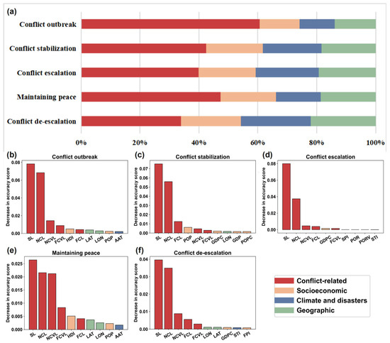 The driving factors of different types of SCDi transformations. (a) The cumulative contribution of each variable type to the five types of SCDi transformations; and the top 10 variables by their decrease in accuracy score for (b) conflict outbreak, (c) conflict stabilization, (d) conflict escalation, (e) maintaining peace and (f) conflict de-escalation. SL: SCDi last year; NCL: number of conflicts last year; FCL: fatalities of conflicts last year; NCVL: number of conflicts in the vicinity last year; FCVL: fatalities of conflicts in the vicinity last year; LAT: latitude; LON: longitude; HDI: human development index; POP: population; POPC: population change; AAT: average annual temperature; SPI: standard precipitation index; STI: standard temperature index; GDP: GDP; GDPC: GDP change; FPI: food price index; POR: peacekeeping operations records; PORV: peacekeeping operations records in the vicinity.