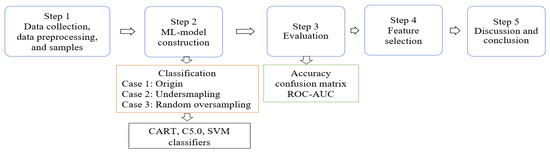 Although the CART model in Case 3 achieved the highest accuracy (93.6%), the use of random oversampling (SMOTE) to address class imbalance may lead to overfitting, limiting the model’s generalizability to new data. Future studies could consider adopting additional techniques to mitigate overfitting, such as ensemble learning methods (e.g., bagging and boosting) and cross-validation. These approaches can enhance model robustness and improve predictive performance across diverse datasets.