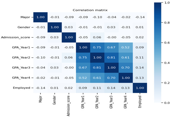 Table 4 describes the input and output factors. The input factors comprise the students’ major, gender, admission scores, and GPA during the four academic years of the bachelor’s program. The output factor is recent graduates’ (un)employment within 6 months after graduation. For ease of interpretation and data consistency, we used ordinal encoding for categorical data: major and gender. It is unnecessary to transfer the admission scores and the GPA of the four academic years since they are already numerical data. Figure 2 presents the correlation matrix for these factors.