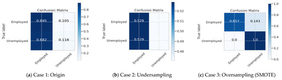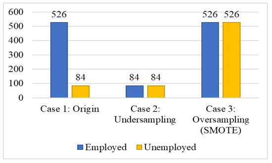 We used the output factor “employed” as a class label to classify the dataset into three cases, as shown in Figure 3. Case 1 used the origin data as a base comparison. Case 2 randomly undersampled the majority class “employed”, while Case 3 oversampled (SMOTE) the minority class “unemployed” to address problems relating to imbalanced data, which often cause low accuracy. Figure 3 shows the number of graduates in the three classification cases.