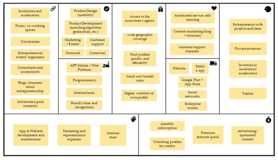 Figure 2 shows the main strategic elements in terms of customer segments, value offers, channels, relationships, income sources, costs, key resources, activities and partners for this specific business model. These elements resulted from the analysis of similar ideas and underlying platforms and of aspects related to these kinds of stakeholders and activities. By focusing on these key components, the project can gain a holistic understanding of its operations, potential issues, and levels of integration and, thus, develop a more effective and flexible tool [].