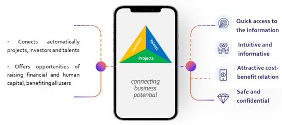 The present project, “Tri-Collab”, resulted from the detection of these challenges and, therefore, from the opportunity to create a digital platform that can bring together, in a single place (digital), the main agents involved—entrepreneurs with their projects/ideas; public and/or private investors; and other agents who wish to integrate and collaborate within the chosen project(s) according to the fit of their abilities/talent in its required profile of action (Figure 1).