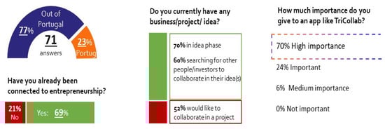 In total, 71 answers were obtained, where the majority had/have some connections to entrepreneurship. Among the participants, 70% still have their projects at the idea stage, and 60% are looking for investors and other agents to collaborate. Regarding the importance of an app like TriCollab, 70% of the participants consider it highly important.