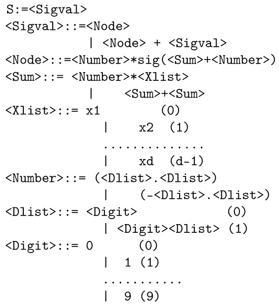 In this equation, the term H represents the number of processing units (weights) of the network. The function stands for the sigmoid function. The grammar used by Grammatical Evolution to produce neural networks in the form of Equation (2) is outlined in Figure 2, which has been in the initial work for neural network construction with Grammatical Evolution [69]. This method has been incorporated in problems such as chemistry problems [70], estimation of solutions of differential equations [71], etc.