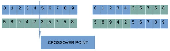 - Application of crossover. During this procedure, new chromosomes will be created from selected chromosomes from the current generation. For each pair of produced chromosomes, two chromosomes and will be selected from the current population using tournament selection. The new chromosomes will be produced using one-point crossover [72], which is graphically illustrated in Figure 3.