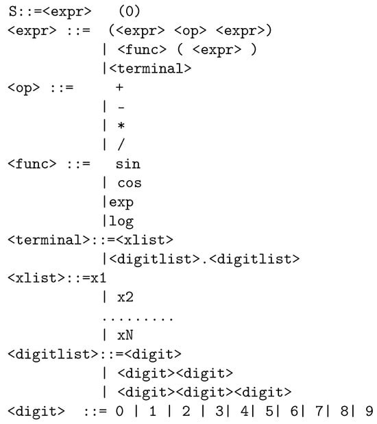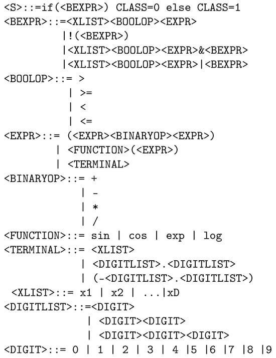 The algorithm of Grammatical Evolution can be considered as a genetic algorithm where the chromosomes, which are series of positive integer values, denote production rules of any given BNF (Backus–Naur form) grammar [56]. The method has been incorporated in various cases from real-world applications, such as data fitting [57,58], solutions of trigonometric equations [59], composition of music [60], neural network construction [61,62], producing numeric constraints [63], video games [64,65], energy problems [66], combinatorial optimization [67], cryptography [68], etc. The BNF grammars are used to describe the syntax of programming languages and can be defined as sets , where
