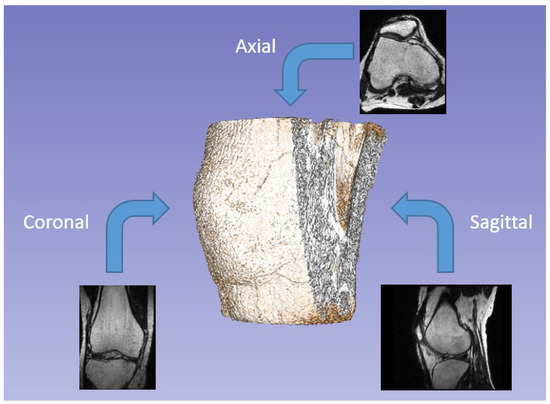 The first approach involved obtaining various projections from the same scan (Figure 1). Since the analyzed data consists of 3D images, the reference unit is the voxel rather than the pixel. Each image’s voxel corresponds to an area of 0.351 mm × 0.351 mm, and the slices are mm apart. This arrangement positions them approximately one pixel apart, resulting in nearly isotropic voxels. The MRI scan used for training is a sagittal view of the knee, but axial and coronal views are also commonly examined during medical assessments. Due to the high-resolution procedure used to generate the scans, there are a total of 286 slices, each with a resolution of . Consequently, we can perform matrix rotations to create additional projections by treating the entire volume as a three-dimensional array. This process generates new data for training purposes.