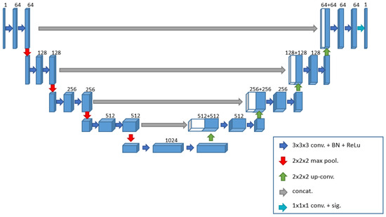 In addition to extending to the third dimension, the proposed network includes other changes to better adapt to the problem at hand. The network consists of an encoding phase and a decoding phase, the former progressively reduces the spatial dimension of the volume and increases the number of channels, extracting increasingly abstract and high-level features, while the latter performs the opposite operation, reconstructing the segmented image from the extracted features. Each phase comprises specific blocks, which share two operations: two 3D convolutions and the application of the ReLU activation function. Unlike the original paper [18], we chose to perform a batch normalization process after each convolution to normalize the elements and facilitate learning [21,22]. This technique helps stabilize the distribution of inputs, accelerate convergence, and reduce sensitivity to hyperparameters. We will refer to this set of operations as the convolutional block for simplicity. With this premise, we can now describe more clearly the operations performed during the encoding and decoding phases. In the encoding phase, the convolutional block is executed at each step, followed by a 3D max pooling operation with a window size of (2, 2, 2), reducing the volume by half in each dimension and passing the output to the next level. Simultaneously with the reduced volume, the number of feature channels increases for each block. We marked the transition from the encoding phase to the decoding phase with a bridge layer consisting only of a convolutional block with 1024 filters. During the decoding phase, as indicated in the original paper [18], to return to the initial dimension, each block performs an upsampling operation followed by a convolution.