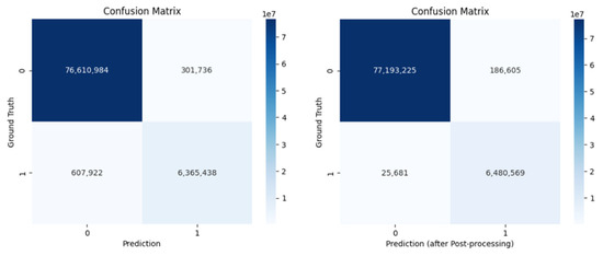Comparison of confusion matrices before (left) and after (right) post-processing, showing the segmentation performance against ground truth labels.
