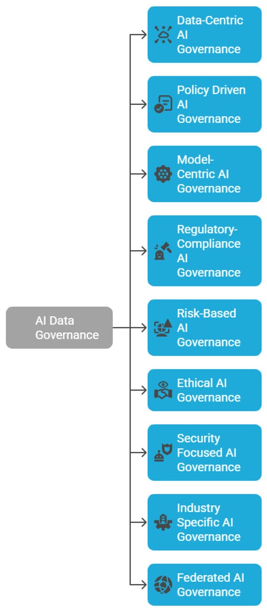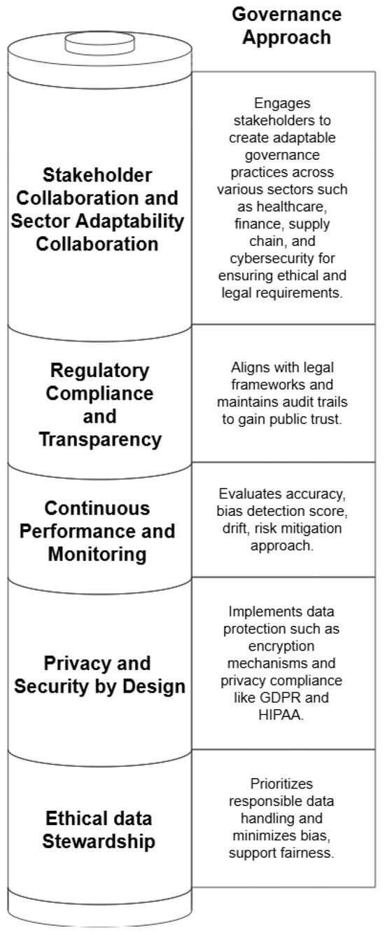 | Risk-based governance | AI risk management: identifies potential AI risk (e.g., algorithmic bias, data privacy breaches, and security vulnerabilities) and applies data governance controls | Financial and operational risk, security and cyber risk management, and algorithmic risk management | [89,90] |