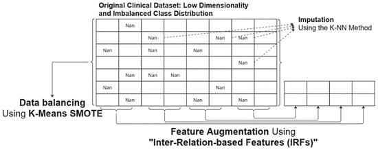 Conceptual diagram of hybrid data enrichment framework, using inter-relation-based features for feature augmentation and K-Means SMOTE for data balancing.
