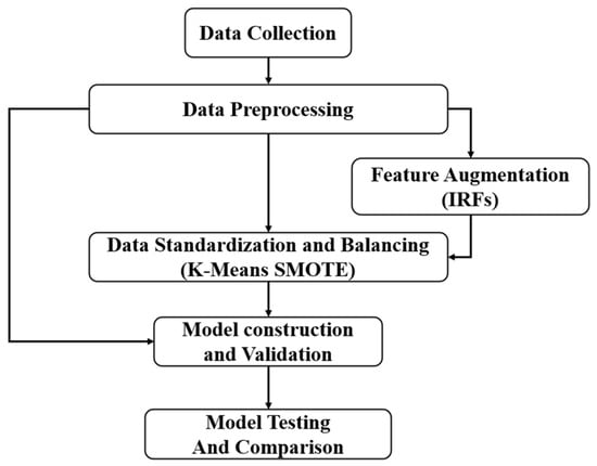 Research methodology including data collection, data preprocessing, feature augmentation, data standardization and balancing, model construction and validation, and model testing and comparison.