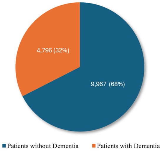 The data used in this study are EHRs from Chiang Rai Phachanukroh Hospital, Chiang Rai Province, Thailand; they comprise 14,763 records including 4796 records of patients with dementia and 9967 records of patients without dementia (heart failure and heart valve disorders), and originally included 22 features. The data proportions are shown in Figure 3.