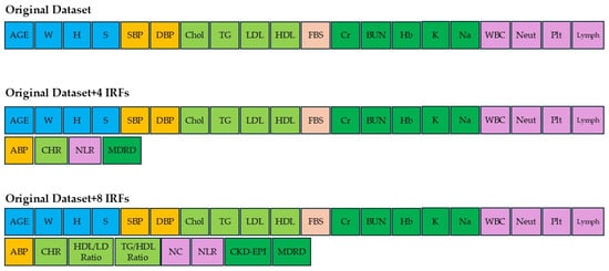 Figure 1 shows that the hybrid data enrichment framework increases the dimensionality of the original dataset for both the number of features and the number of examples. For feature augmentation, each IRF was constructed from features within the same group. In this study, five groups of features were used to derive relationships: (1) blood pressure, (2) lipid levels, (3) blood sugar levels, (4) renal and chemical substances, and (5) blood cell count. The creation of new features based on existing mathematical relationships, which are derived from medical domain knowledge, is expected to increase the diversity of the data and promote explainability without introducing new biases into the newly generated, more informative features. By creating interaction terms, relationships that might not be evident in the original features are expected to be captured. For data balancing, K-Means SMOTE was selected to increase instances of the minority class, which is the dementia class. Incorporating these augmented and newly synthesized data into the original dataset is expected to improve the overall performance of the ML model. Furthermore, this study aims to determine which combination of datasets is able to enhance the performance of ML-based classification models.