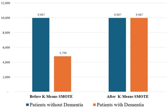 Dataset before and after applying K-Means SMOTE. The minority class (patients with dementia) was resampled to match the number of instances of the majority class (patients without dementia).