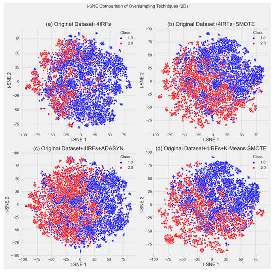 To verify structural differences in synthetic data, t-SNE was used to visualize datasets after applying IRFs with SMOTE, K-Means SMOTE, and ADASYN, as shown in Figure 6.