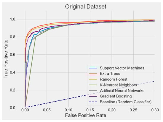 An ROC curve is a graph used to assess the performance of a classification model by measuring its ability to distinguish between positive and negative classes at different threshold values. The following information is available: (1) true positive rate (sensitivity, recall): the ratio of correctly identified positive examples () to the total actual positive examples ( + ); (2) false positive rate: the ratio of correctly identified negative examples () to the total actual negative examples (+ ), as shown in Equation (14).