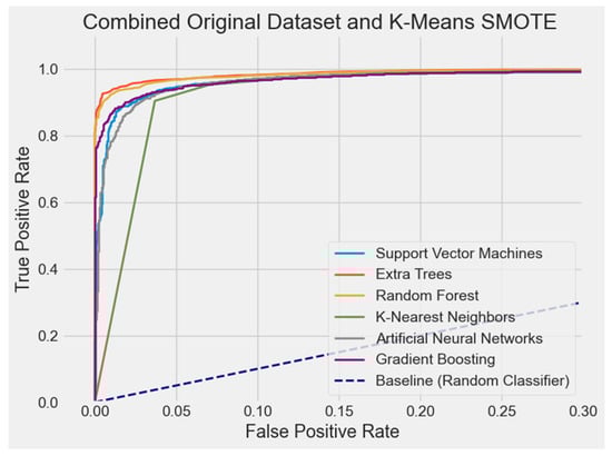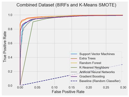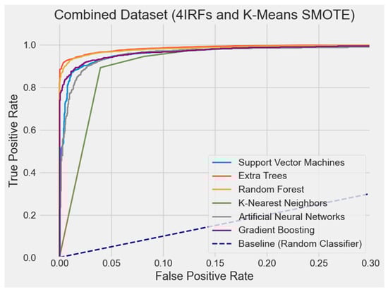 The ET model with the combined dataset, K-Means SMOTE, and four IRFs proved to be the best option based on the assessment criteria; namely, accuracy, precision, recall, F1 score, and AUC-ROC. Maintaining a well-balanced trade-off between precision and recall, ET routinely performed well across all measures, with the best accuracy (96.47%), strong precision (94.79%), and solid recall (97.86%), as reflected by its high F1 score (96.30%). Its AUC-ROC (99.51%) was also the greatest, suggesting exceptional classification capability. Although certain models—such as RF and GB—also showed good performance, ET’s stability and robustness across all measures made it the best one. In comparison, the four IRFs with K-Means SMOTE enhance model performance more effectively, while the eight-IRF setup shows minor declines, suggesting that added complexity may introduce noise. In this work, ET with K-Means SMOTE and four IRFs is thus the most efficient model–data combination since it strikes the optimal balance between predictive power and generalization.