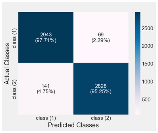 Recall (also known as sensitivity or rate) is the ratio of correctly classified instances to all instances that truly exist. Recall expresses the number of positive instances that were correctly predicted relative to all instances that are actually positive (including those predicted incorrectly—. It is calculated as the ratio of to the sum of and , as shown in Equation (12).