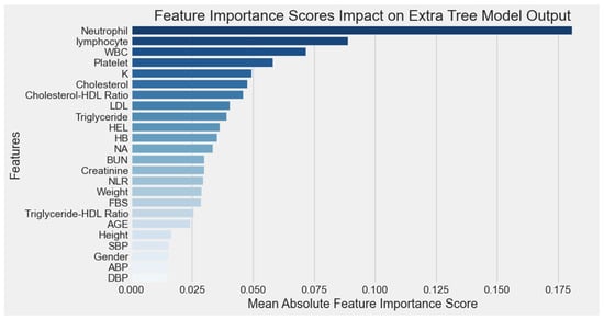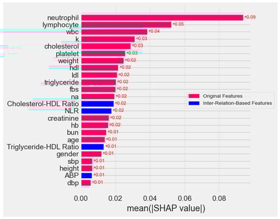 In terms of model sensitivity, the analyses in Figure 12 and Figure 13 confirm that while raw biomarkers such as neutrophil and lymphocyte exert the strongest influence on predictions, the four IRFs (ABP, NLR, Cholesterol–HDL Ratio, and Triglyceride–HDL Ratio) also contribute to the model’s sensitivity, albeit to a lesser extent. Their moderate SHAP values and importance scores indicate that small variations in these features can still influence model output, underscoring their role as meaningful supplementary predictors. This highlights the model’s ability to integrate both raw and composite features.