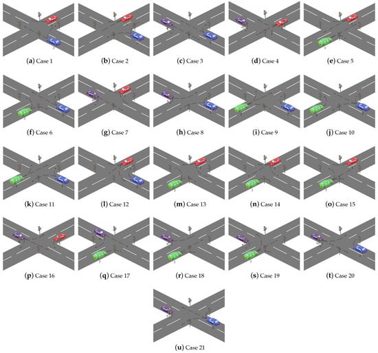 Possible cases of traffic flows that can traverse the intersection simultaneously.