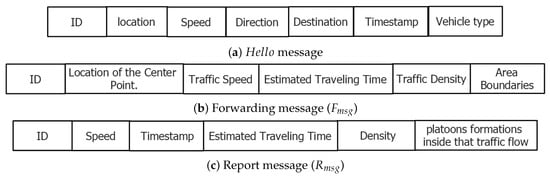 Figure 2 illustrates the main components of the three main required messages in smart adaptive traffic light scheduling algorithms. As vehicles move, they periodically broadcast “” messages. These messages transfer the basic data of each vehicle to its surrounding vehicles and infrastructures (i.e., roadside units). The basic data mainly includes the vehicle’s identity (i.e., plate number), location, speed, direction, destination, and other parameters such as timestamp and vehicle type. Figure 2a illustrates the main fields of the message. Upon receiving several “” messages from neighboring vehicles, each vehicle can compute its surrounding area’s traffic speed and density (i.e., traffic characteristics inside its transmission range). Then, forwarding the traffic characteristics in a multi-hop fashion through different transmission ranges helps the vehicles generate a more general traffic evaluation of an extended area of interest that may cover the entire road scenario. Forwarding messages (’s) are transferred by elected vehicles between different transmission ranges. contains mainly the identity of the forwarding vehicle, the boundaries of the considered area, the traffic speed, traffic density, estimated traveling time, and other parameters such as timestamp and location of the center point of the considered area of interest. Figure 2b illustrates the main fields of the message. Upon receiving ’s, the boundaries of the evaluated area are extended, and the considered traffic characteristics at each considered vehicle are updated accordingly.