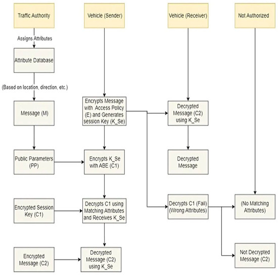 In this section, we introduce a Confidential Intelligent Traffic Light Control System (CITLCS). This system incorporates attribute-based encryption to ensure privacy and security in vehicle-to-vehicle (V2V) and vehicle-to-infrastructure (V2I) communications. Attribute-based encryption (ABE) is a cryptographic technique that uses a set of public attributes as the basis for fine-grained resource protection [46]. The primary goal of the CITLCS is to limit the exposure of information to unauthorized entities and preserve anonymity within the network. Moreover, it aims to prevent all unauthorized traceability and linkability of vehicles’ identities to enhance the safety conditions and privacy of vehicles and their drivers. Figure 4 systematically illustrates the message encryption process in the proposed confidential protocol. The main steps of the CITLCS are summarized in the following four points.